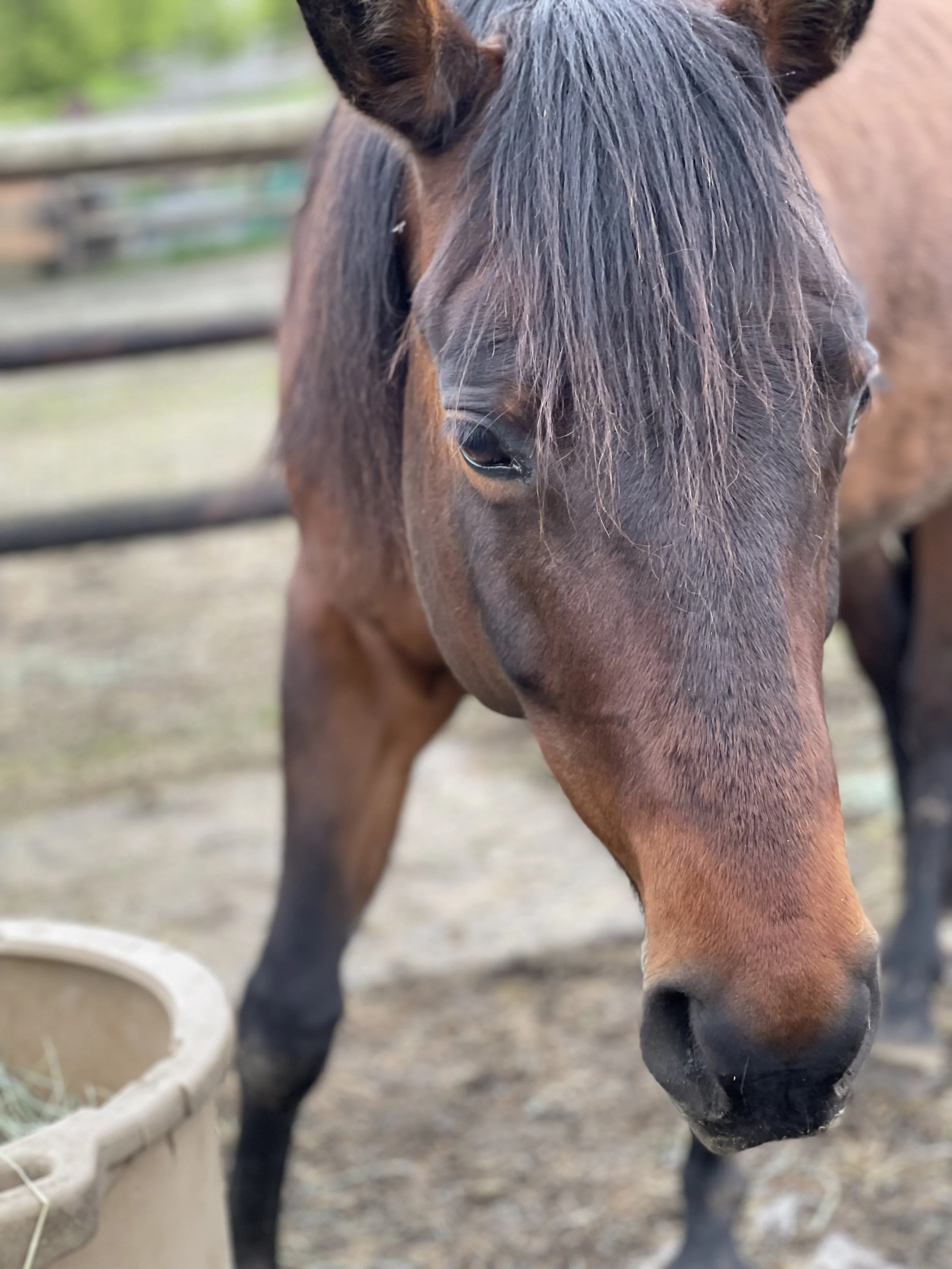 You can recognise Abby as the fully brown horse with no white stripe on her face. She was rescued from a feedlot by SAS when she was just three years old. She was rescued with her 3-week-old baby, who we named Magic, because these two are magical! Both were unbroken at the time of their rescue, which made them higher risk for feedlots. Both were very sick, and Abby had several injuries as well. We brought them to the sanctuary and met our vet there to give these two the immediate care they needed. Later, we brought Abby to a professional trainer who worked with her for 3 months. Abby was a quick and gentle learner who has become a sweet, safe horse for all levels of riders. Nearly three years later, we took Magic to be trained as well, and her trainer fell in love with her. We ended up letting the trainer keep her, and now she is a model horse for horse clinics around the country. Abby is usually in the horse pasture or the arena with Zoey and Pepper, but when the weather is warm, they sometimes are moved to the back pasture.