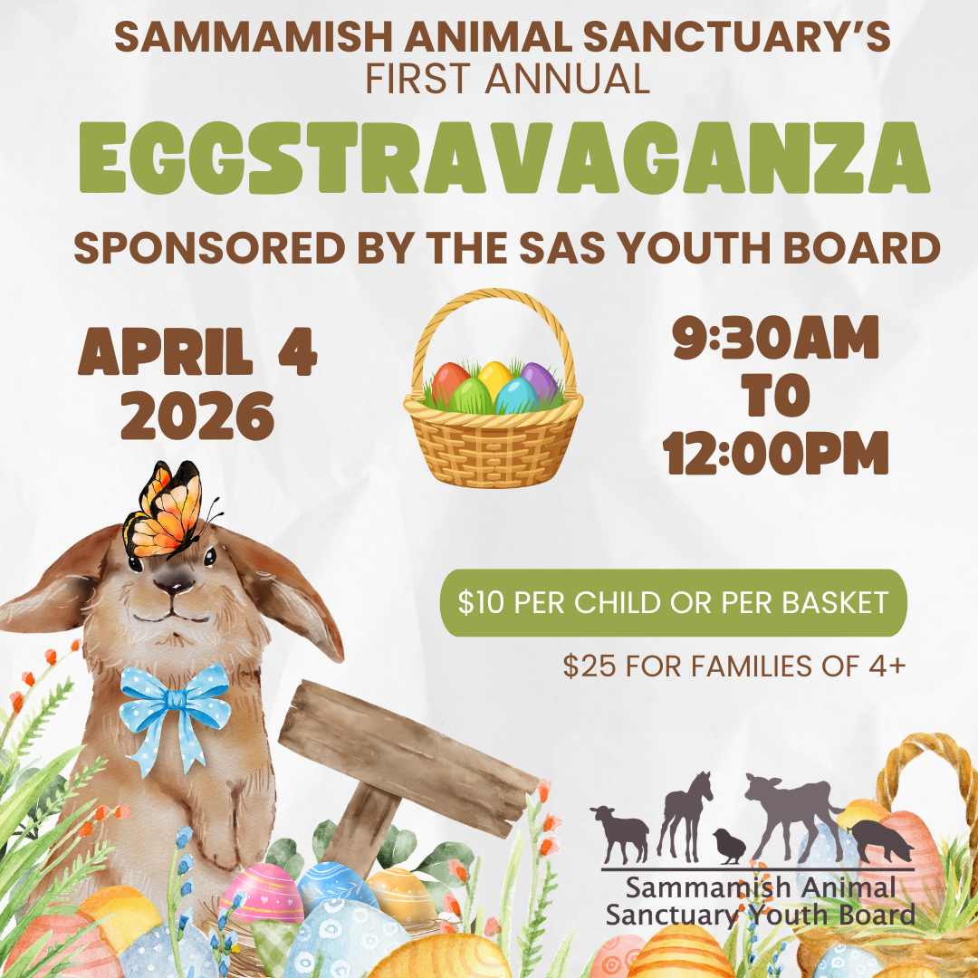 Join us on Saturday, April 4 for our First Annual Eggstravaganza Easter event! Hosted by our Youth Board, we’ll have baskets for the kids and lots of filled eggs hiding all around the sanctuary so hop on over and join the fun! All proceeds go directly to helping the animals live an egg-cellent life!